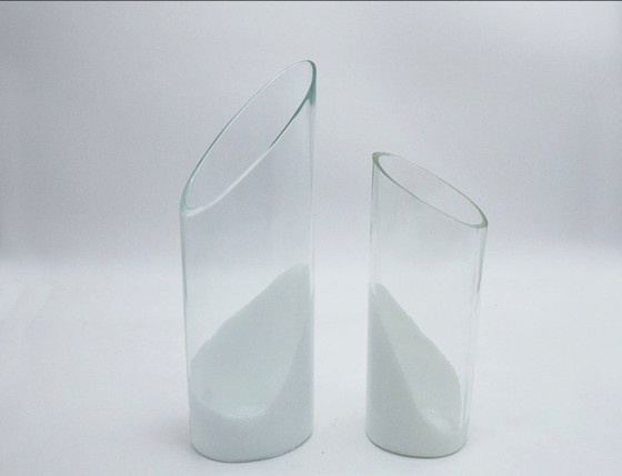 Salviati Murano, design Betha and Teff Sarasin, rare “Philadelphia” vase from the 1970s. Clear glass vase with a white glass “stain” appliqué on the irregularly shaped base and a distinctive slanted rim. Only the taller vase is for sale. In excellent condition