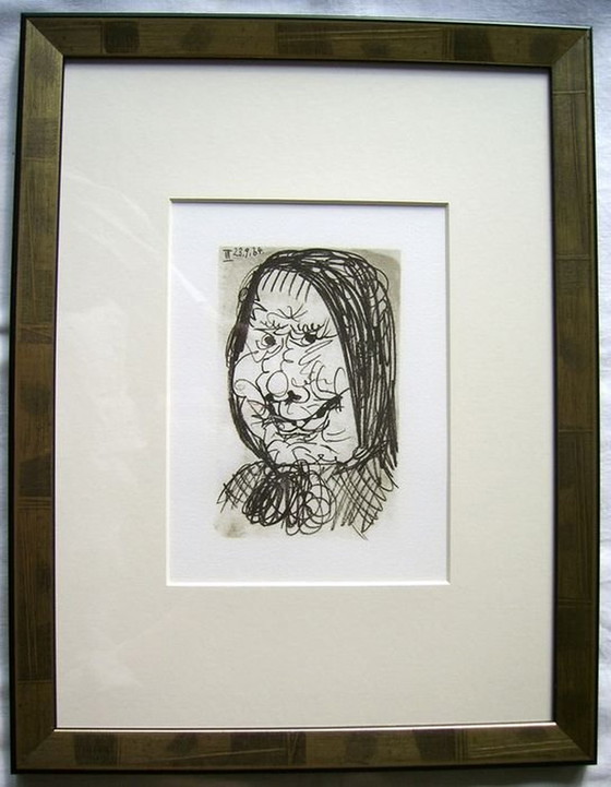 Original lithograph, in fine, old-gold-colored frame; Dimensions: 44 x 34 cm (frame), 32 x 25 cm (sheet), 22 x 16 cm (visible portion of sheet). This lithograph belongs to the series "Le goût du bonheur," which Picasso had published by the German publisher Carl Schunemann in 1970 at the insistence of some friends. Indeed, his friends had shown him the extraordinary quality that Schunemann's printer - the Munich studio Dietz Offizin - exhibited in the production of lithographs. Picasso was so taken with it that he immediately grouped together a number of unpublished drawings (68 in all) to have them lithographically printed by Dietz Offizin. Three partners united to make the publication possible: Cercle d'Art (Paris), Harry N. Abrams (New York), and Carl Schunemann (Bremen). Each of these publishers accounted for 666 copies, so that a total of 1998 copies were printed. The sheet framed here comes from Carl Schunemann's reserve. Picasso himself followed the printing process very closely and corrected the printing where necessary, so that the sheets acquired maximum authenticity. The title of the series ("Le goût du bonheur") was also given to the series at Picasso's suggestion. In perfect condition. Shipping only within the European Community. Shipping cost: 1. Without track-and-trace. Within Belgium: 12 €; To the Netherlands, Germany, Luxembourg or France: 16 €; To all other EC countries: 18 €. 2. With track-and-trace: Within Belgium: 14 €; To the Netherlands, Germany, Luxembourg or France: 22 €; To all other E.C. countries: 40 €.