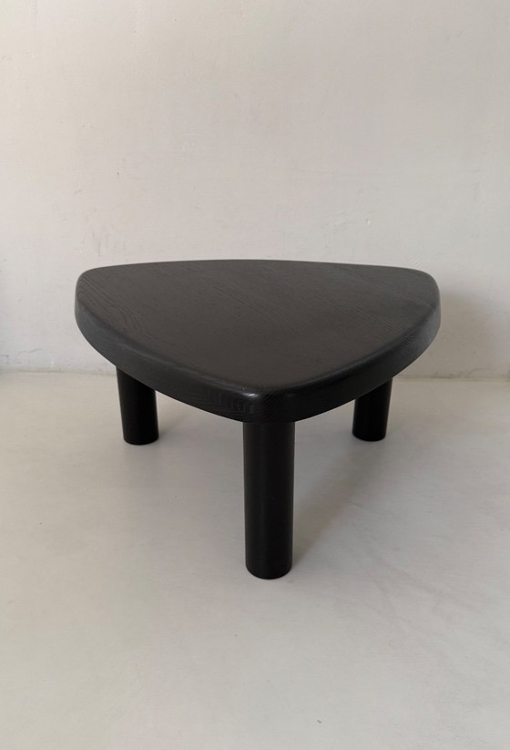 Thanks to its small footprint and triangular shape, the T23 coffee table by Pierre Chapo is a design object that can be placed anywhere. At the same time, it stands out for its remarkable volume (the top is five centimeters thick) and the roundness and thickness of its legs.