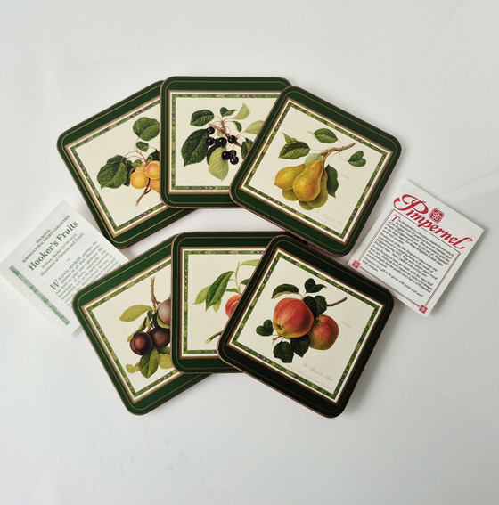 Vintage original Pimpernel Coasters / Saucers "Hooker Fruits" made in England. Heat resistant up to 100 degrees C, very high quality workmanship, 10.5 x 10.5 cm, perfect condition in original packaging with instructions.
