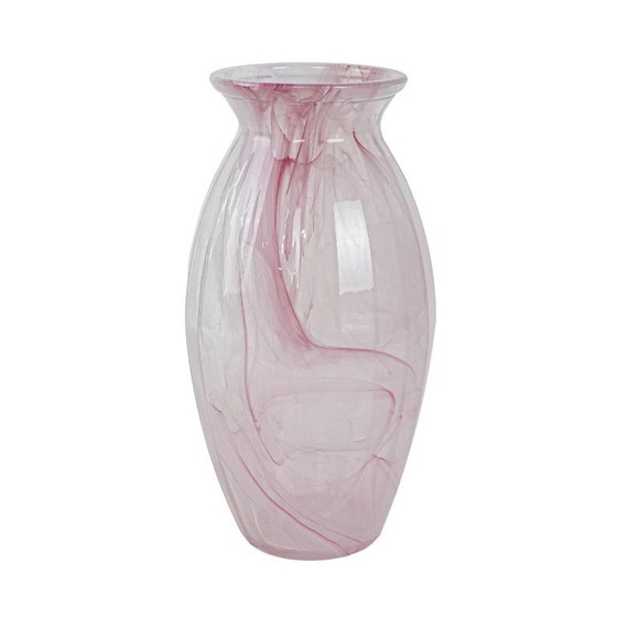 A blown glass vase in shades of pink, with decorative streaks embedded in the glass. Probably produced in the 1980s–1990s, in the style of an artistic glass studio. Its subtle colours and unique pattern make it an impressive interior decoration, both in classic and modern arrangements.
