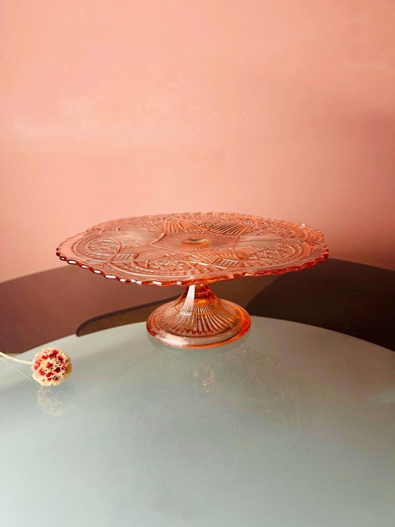 Wow, what a real eye-catcher on your table! This beautiful pink pressed glass cake stand creates a warm, retro-chic look. The rich relief pattern, elegant base, and radiant amber sheen make it a true eye-catcher. It looks fantastic on your table at a (birthday) party, a dinner (with savory tarts), or a high tea. It also looks great as a decorative piece in a kitchen or cupboard.
