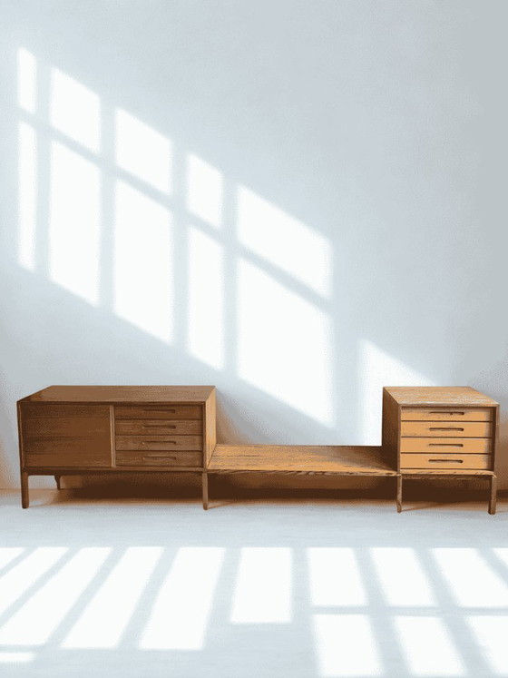 Beautiful minimalist sideboard in a warm wood tone. This special piece of furniture consists of two cabinet elements connected by an elegant, low middle section – a subtle nod to Japanese and Scandinavian design.
