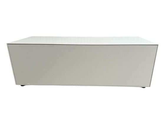 The Nex Pur Box TV box 120 x 40 x 48 cm is designed by the German brand Piure. Pure and beautiful like nature, a complex structure in simple lines, versatile in use and refined in finish, this is how you can describe Piure's Nex Pur modular system. The entire production process of the cabinets, storage systems and sideboards takes place responsibly and sustainably in Germany. The Nex Pur Box TV box 120 x 40 x 48 cm in austere cube shape is made of wafer-thin MDF tops, mitred and perfectly matched. The box appears to float due to the plastic sliding feet at the bottom. The media flap at the front opens with a light finger pressure. Fine perforations in the flap allow you to use the remote control as usual and allow sound to exit. The inside for your tech gadgets and the like is divided in half by a thin sheet and has a coverable cable port in the back.