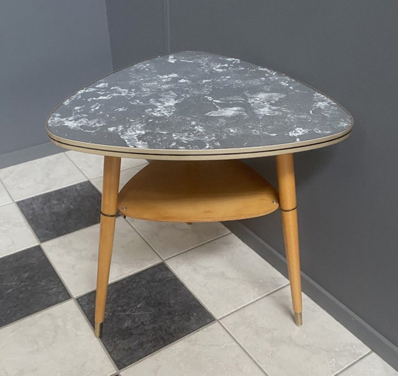 Step back in time with this charming plectrum-shaped coffee table from the 1960s. Its unique formica top, adorned with a marbled grey pattern, offers a striking contrast to the warm wooden legs, embodying the quintessential Mid Century Modern aesthetic. Perfect for adding a touch of vintage flair to your living space, this table is both a conversation starter and a functional piece of furniture.