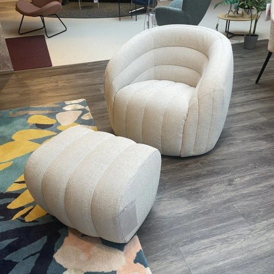 Pode Balini armchair with ottoman. A stylish Pode swivel armchair with a matching ottoman. Both are upholstered in Elva 137 fabric, light grey with tone-on-tone stitching. Dimensions: 90x88x74 cm, seat height 43cm, seat depth 55cm. The ottoman measures 58x51x42 cm.