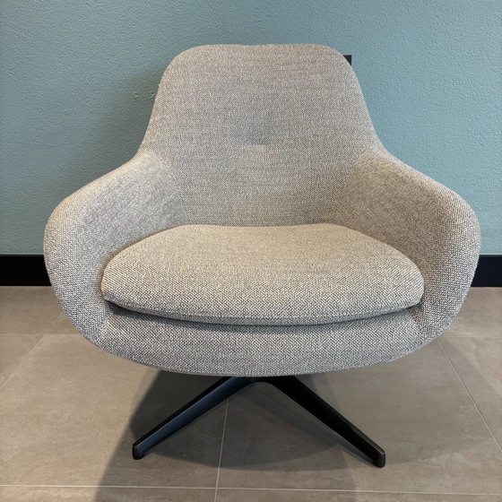 The Pode Sparkle One armchair is a delightfully modern swivel chair that also boasts a powerful retro look. Designed by Up Close: Thijs Smeets. Finished in Fresco 402 Almond fabric and an E2200 Nuit epoxy base. Minor damage is visible on one toe of the swivel base.