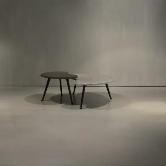 Pode Tubble coffee table (set of 2) Tubble large 117 x 70 x 32 cm Top in marble composite Fio Di Pesco Leg in epoxy E2200 Nuit Silk Tubble small 78 x 48 x 37 cm Top in Oak M4500 Pine Gray Leg in epoxy E2200 Nuit Silk