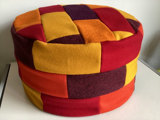 Vilten poef van gele, oranje, rode en paarse stroken, Doorsnede 50, hoogte 35 cm. In prima staat. Met label.
