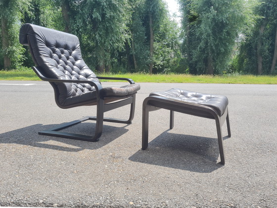 Stylish vintage lounge chair with matching hocker, attributed to Noboru Nakamura for IKEA. This iconic "Poem" chair from the 1970s combines Scandinavian design with delightful seating comfort.