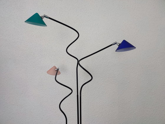 The Pola design (Amsterdam NL) floor lamp is a sophisticated addition to any modern interior. With its sleek, black metal base and three colorful lampshades in green, blue, and pink, this lamp offers a playful yet elegant look that enlivens any space.