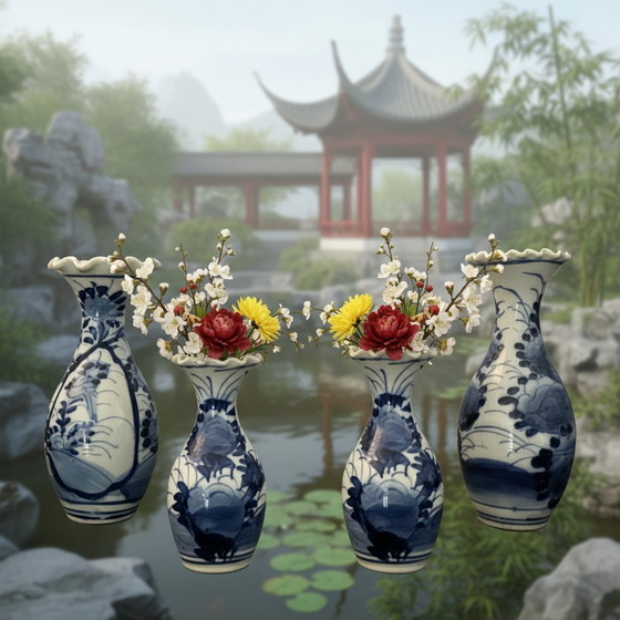 These exquisite porcelain vases, adorned with intricate blue and white decorations, evoke a sense of timeless elegance. The delicate scalloped edges add a touch of sophistication, making them a perfect addition to any refined interior.