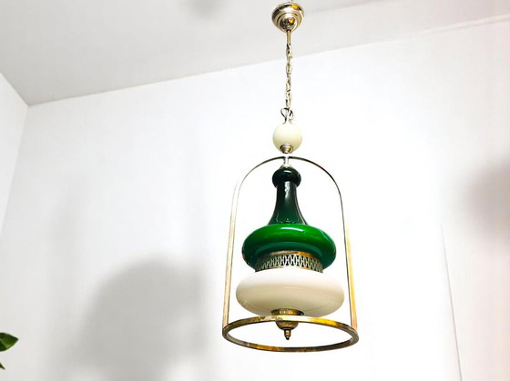 Made of a combination of emerald green opaline and white milk glass. The frame is in aluminium, and the support is in steel.