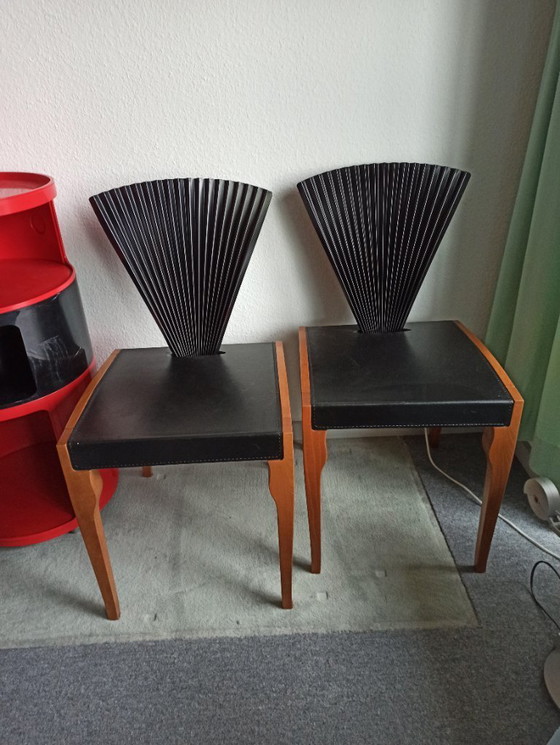 Two chairs that perfectly represent the 1980s. Designed by Emmanuelle Zenere, they are practical for everyday use, making them eye-catching yet functional. Made of walnut, leather, and sturdy aluminum.