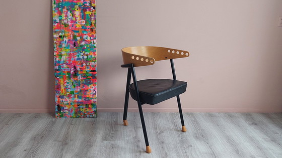 Rare Postmodern Design arm chair. In the Memphis Milano style. Very likely made in the 80s...and I thought of Harvink as the manufacturer, but upon inquiring with Harvink themselves I found out that it was not made by them. Who did is the big question...but that it is a great design is certain! Its size makes it great as a dining room chair, but it is also a great little armchair. It sits wonderfully. H 75 x W 55 x D 53 x Seat height 46 cm. The chair has some wear, see the detail photos.