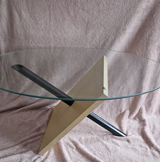 Unique coffee table with an oval tempered glass top (approx. 8 mm) and a sculptural, cross-shaped base. The base combines light wood veneer with black lacquered metal tubing, creating a graphic and modern look.