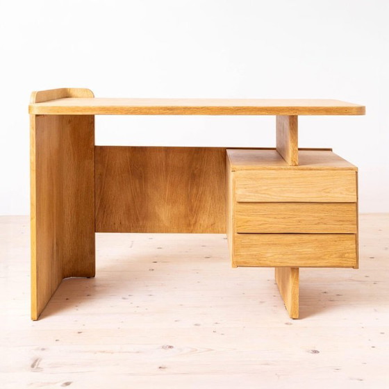 Recently restored to excellent condition, the desk’s oak veneer has been expertly refinished with oil, resulting in a beautifully natural and smooth finish. Ideal for optimizing smaller spaces without compromising on style, this desk is a statement piece that effortlessly combines form and utility.