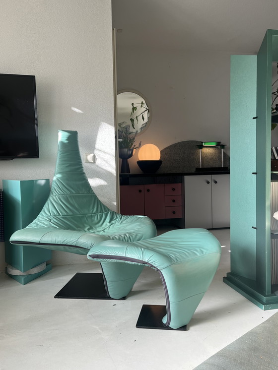 Experience the epitome of postmodern design with the Harvink "Turner" relax chair, crafted by the renowned designer Jack Crebolder. This exquisite piece, accompanied by a matching hocker, invites you to indulge in unparalleled comfort and style. Its striking mint leather upholstery exudes a refreshing elegance, making it a standout addition to any contemporary living space. The chair's sculptural form is supported by a robust metal base, ensuring both stability and aesthetic appeal. Perfect for those who appreciate innovative design, this chair promises to be a conversation starter in your home. Inquire today to make this iconic piece yours.