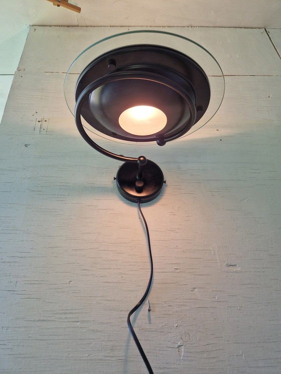 This postmodern Steinhauer UFO wall lamp is a unique addition to any interior. The design combines a futuristic look with functional lighting. The lamp is made of high quality metal and glass, providing a durable and stylish finish. Perfect for modern living spaces that need a touch of contemporary flair.