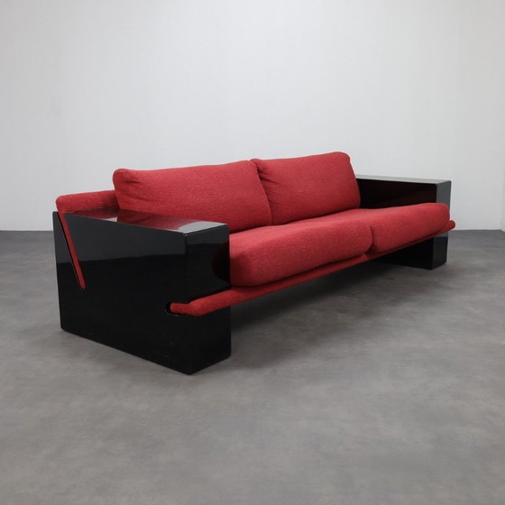 Striking postmodern three-seater sofa from Italy, dating to the 1980s. With its bold black lacquered frame and deep red fabric cushions, the design balances sculptural presence with inviting comfort. A strong geometric silhouette and contrasting textures make this a true statement piece from the radical era of Italian design.