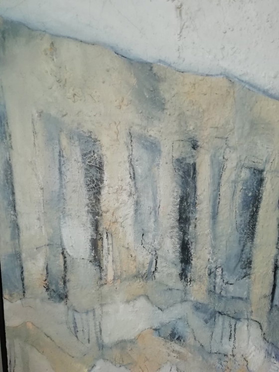 This beautiful abstract painting, titled 'Posts by the Sea', captures the essence of the coast with a subtle blend of beige, blue, and grey tones. The texture and color contrasts evoke the serene atmosphere of a seascape, while the abstract forms stimulate the imagination.