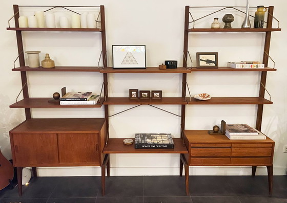 Includes one original base unit with drawers, one Preben Sørensen cabinet (compatible with Cadovius) with sliding doors, and nine teak shelves with original brass supports.