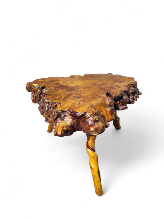 Step back in time with this exquisite Primitive 1950s Burlwood coffee table, a true testament to mid-century design. Crafted from rich, natural wood, this piece exudes a rustic charm that is both timeless and captivating. Its organic form and unique grain patterns make it a standout addition to any living space.