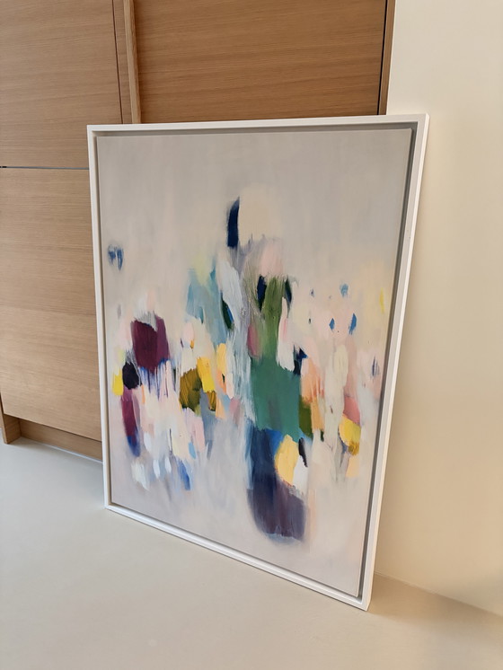 Immerse yourself in the vibrant world of abstract art with this beautiful work by Lola Donoghue, titled "Shimmer Shimmer." This signed print, elegantly framed, displays a symphony of colors dancing across the canvas, inviting contemplation and admiration.