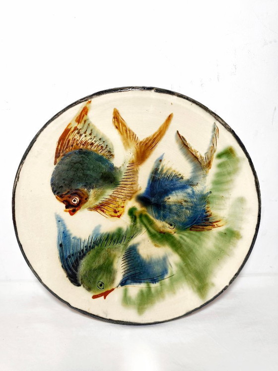 This is a charming vintage ceramic plate from the 1970s, crafted in Spain by Puigdemont. The plate features a vibrant design of colorful fish, showcasing a blend of green, blue, and brown hues. Its artistic appeal makes it a delightful decorative piece for any home.