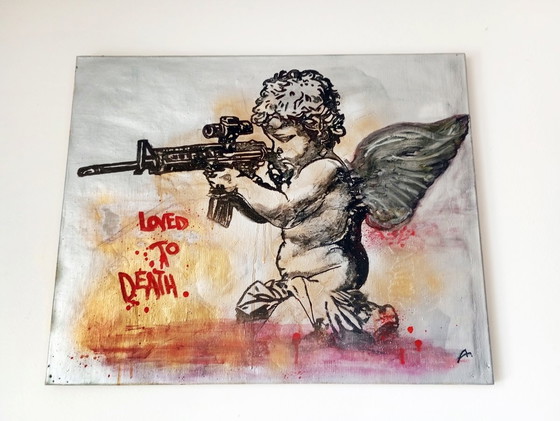 'Putto with a machine gun' - street art/pop art large-scale oil and mixed media canvas painting, approx. 2010--Unknown street artist--