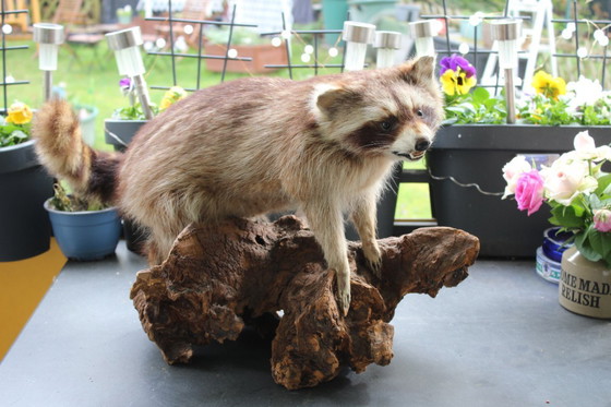 This taxidermied raccoon is a fascinating collector's item, mounted on a large, heavy root. With its open snout and real teeth, it appears remarkably lifelike. An ideal decorative object for nature lovers and collectors, it adds a touch of the wild to any room.