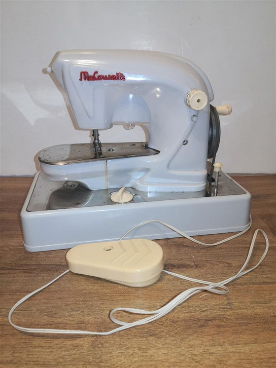 Antique toy Ma Cousette sewing machine. Still in good condition (with a few small rust spots on the stainless steel finish). Features a wired pedal. Motor tested (in 5 volts) works with mechanical drive and functional belt. Retro 1960s vintage.