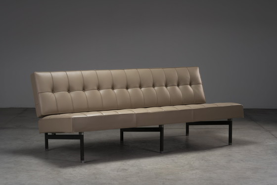 This is the first production, the metal base lacquered in dark grey (later production chromed) and detailed parts are made in solid aluminum. The sofa is restored by Troon Works with high-quality semi-aniline leather. The foam is replaced for outstanding comfort combined with excellent durability. The straps have been replaced as well; a full restoration has been done.