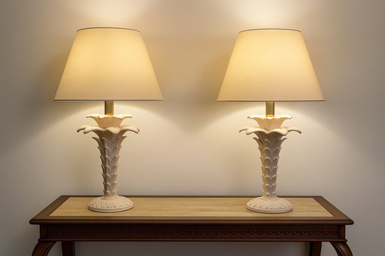 These lamps perfectly embody the Hollywood Regency style of the 1950s-70s, blending neoclassical and tropical influences. Their sculptural form makes them true statement pieces, ideal for consoles, sideboards, or bedside tables.