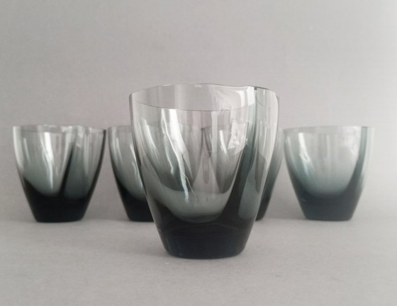 SGHR Sugahara Japanese organic handmade blue smoked glass 'old fashioned' glass set Japan 1970s--Set of 5 SGHR Sugahara Japanese organic handmade blue smoked glass 'old fashioned' glasses Japan 1970s. Very rare.--