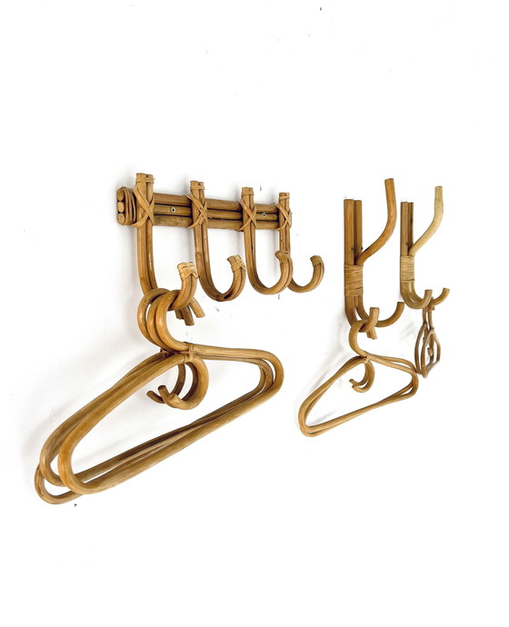 Set of vintage wall coat racks in bamboo & rattan '60s. 2 elegant hooks, 1 wall coat rack with 4 hooks. Matching clothes hangers in rattan and bamboo. In neat condition, easy to hang. Size Height 18-29cm Width 14-38cm