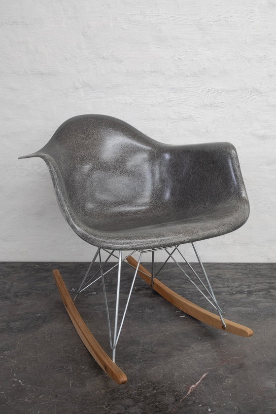 Elephant grey fiberglass Eames rocking chair, Herman Miller Summit. Herman Miller early production (pre-1968). Elephant grey with original rocker base, has small repair on the runners: nicknamed "Moby Dick" in our workshop (resembles a whale face). Repair left visible. Collectors item. We specialize in furniture restoration of modernist design and count Vitra, Herman Miller, and Knoll among our loyal customers.
