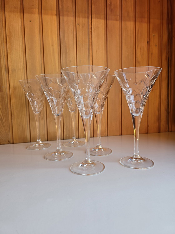 The glasses feature a refined Laurus pattern of tree branches and leaves. There are six glasses, each 20 cm high and 10 cm wide. All six are in mint condition.