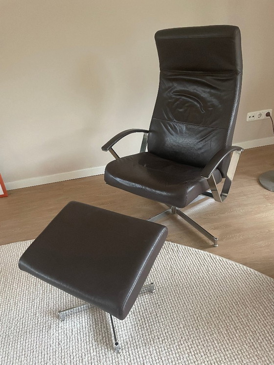 Experience ultimate comfort with this modern recliner and matching ottoman. Upholstered in high-quality brown leather, the set offers a luxurious look and fits perfectly into a contemporary interior. The metal frame provides a sturdy base and a stylish finish. The backrest is infinitely adjustable. A 3-position headrest is included.