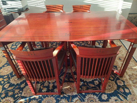 Rectangular long dining table with four luxurious leather-upholstered chairs by Schuitema Stadskanaal. In very good condition.