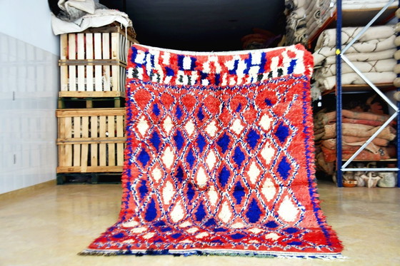 Infuse your space with warmth and character with this striking vintage Boujaad rug, handwoven in the Atlas Mountains of Morocco. Measuring 223 x 145 cm, it features a vibrant yet time-softened palette of red and blue tones, interwoven with abstract Berber motifs that reflect the weaver’s personal story and cultural heritage.
