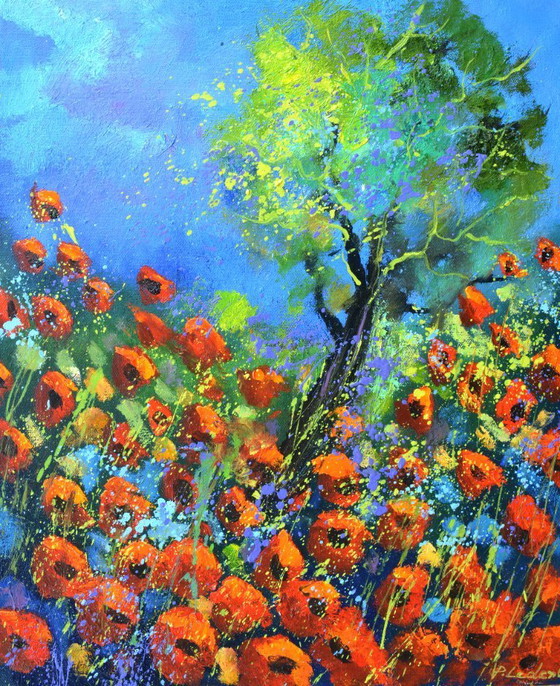 This dazzling artwork features a field of vibrant red poppies beneath a vibrant azure sky, creating a composition that is both dynamic and harmonious. The artist demonstrates an undeniable mastery of painting techniques, using bold brushstrokes and an invigorating color palette. The poppies, painted with meticulous precision, almost appear to dance in a light breeze, their delicate petals creating a striking contrast with the deep blue background. The centerpiece of this work is a majestic tree that stands confidently amidst this sea of red. Its leaves, painted light green with hints of yellow, capture the light with such finesse that they appear to shimmer. This tree, bursting with life, symbolizes resilience and growth amid the poppies' fleeting beauty. The sky, a deep blue dotted with shades of purple, forms a hypnotic backdrop, enhancing the contrast and bringing a fascinating depth to the overall composition. The harmony between natural elements and the play of vibrant colors creates an atmosphere of serenity, energy, and renewal. The texture of the paint is palpable, with each brushstroke adding a tactile dimension to the work. This use of texturals enriches the visual interaction, making this painting an immersive and captivating experience. In short, this work is a triumphant celebration of nature, capturing the very essence of life and floral beauty with remarkable visual eloquence.