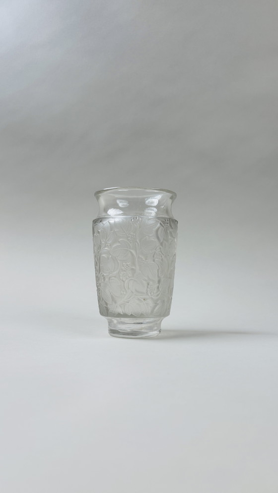 Elegant Lalique "Deauville" crystal vase in frosted crystal with a relief decoration of leaves and berries. A classic Lalique design that beautifully plays with light and shadow.