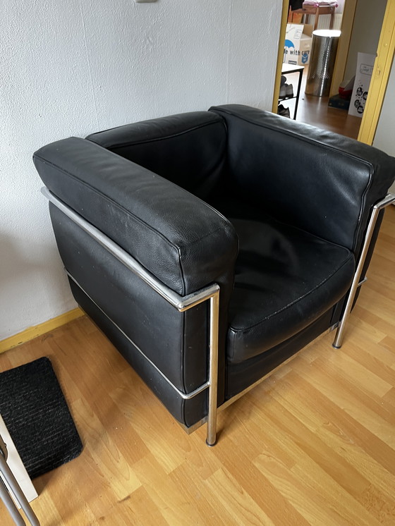 This is a replica of the iconic LC2 black leather armchair, known for its modern and timeless design. The chair features a sleek metal frame and luxurious black leather upholstery, offering both style and comfort. It's a perfect addition to any contemporary living space, providing a touch of elegance and sophistication.