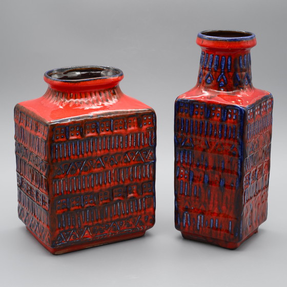 The vases feature bold, **embossed geometric motifs** characteristic of BAY Keramik’s sculptural approach to form. The interplay between the glossy red and dynamic blue glaze creates visual depth, while the textured surfaces offer a striking tactile contrast.