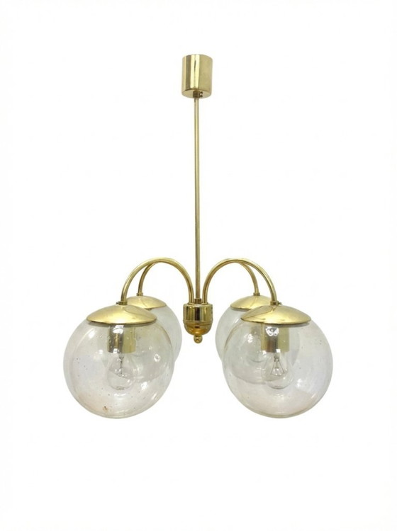 A retro chandelier produced in the Czechoslovak Socialist Republic in the 1960s–1970s by Kamenický Šenov, featuring a gold-chrome plated support rod and caps with four clear glass balls with internal bubbles; the piece remains in original, very well-preserved and fully functional condition. The chandelier combines metal and glass elements typical of mid-century Czech lighting and works as a decorative and functional ceiling fixture.