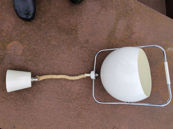 Ceiling rose and spherical shape are in white metal. The chrome frame is 34 cm high with an E27 socket. The total height, when not extended, is 76 cm.