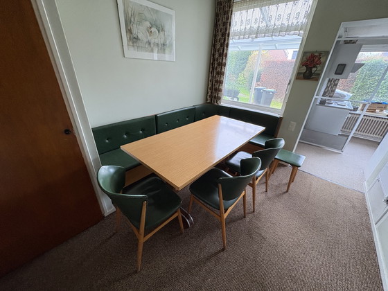 Step back in time with this exquisite retro vintage German corner sofa set, complete with a matching card table, chairs, and stools. This ensemble is a perfect blend of functionality and style, offering a unique charm to any dining or living space.