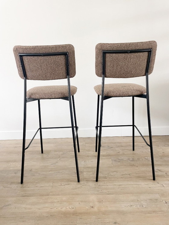 Beautiful bar stool, fully reupholstered in a warm brown bouclé fabric.