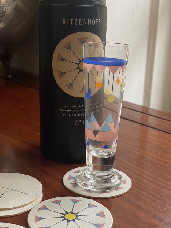 This is a rare Ritzenhoff glass designed by architect Riccardo Dalisi in 1996. It measures 11,5cm and features a multicoloured playful bright design. Made of glass, this unique piece is perfect for enjoying schnapps in style. New never used and comes in original packaging with 5 coasters and a manual.